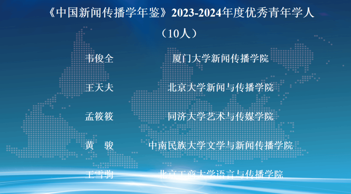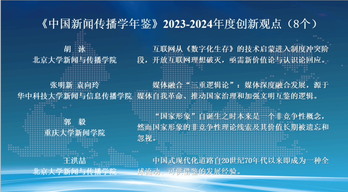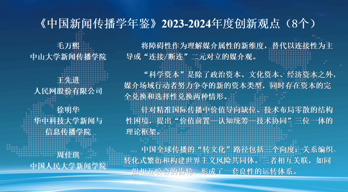 发布会现场,朱鸿军宣读了《中国新闻传播学年鉴(2024-2025)》关注的年度原创理论/概念、创新观点、优秀专著、优秀学人和教育创新案例名单。这份名单的产生经由面向学界征集、15家常务理事单位投票及编辑部统筹平衡等过程,旨在从不同维度反映2023-2024年度新闻传播学研究的优秀成果与学人风采。