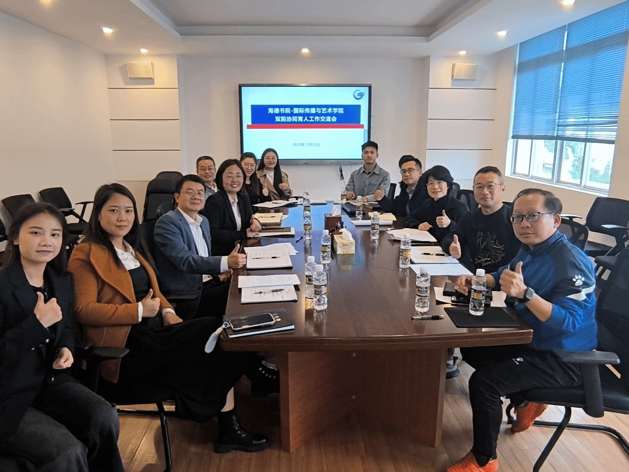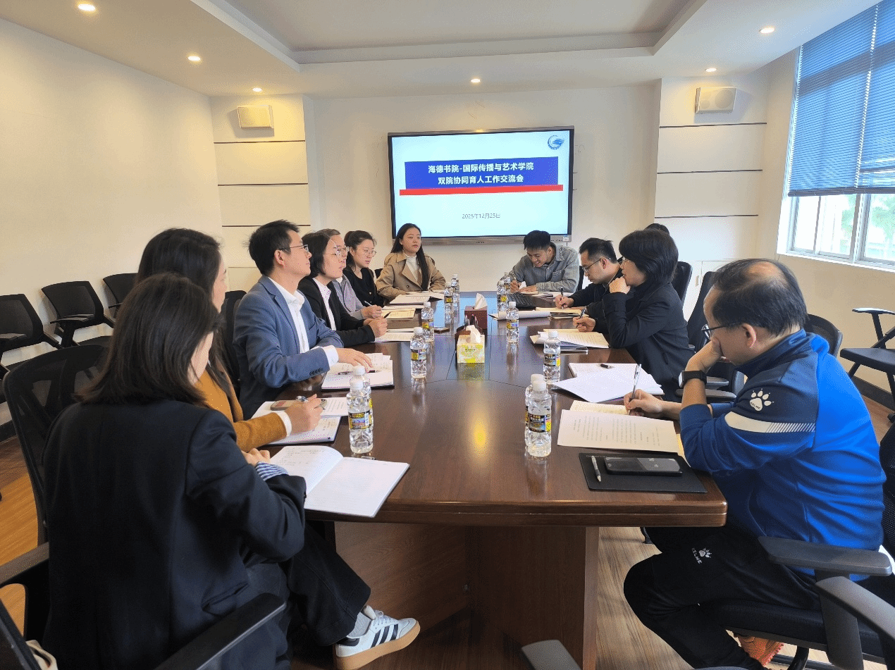 为深化“双院协同、双导共育”育人机制,赋能学生全面发展,12 月 25 日下午,国际传播与艺术学院联合海德书院,在我院田家炳楼 412 会议室召开双院协同育人工作交流会。国际传播与艺术学院党委书记何映敏、党委副书记陈鹏,海德书院党委书记韩胜丁、党委副书记崔建兵出席会议,学院教务办、创新实践办负责人、兼职辅导员及书院辅导员参会。