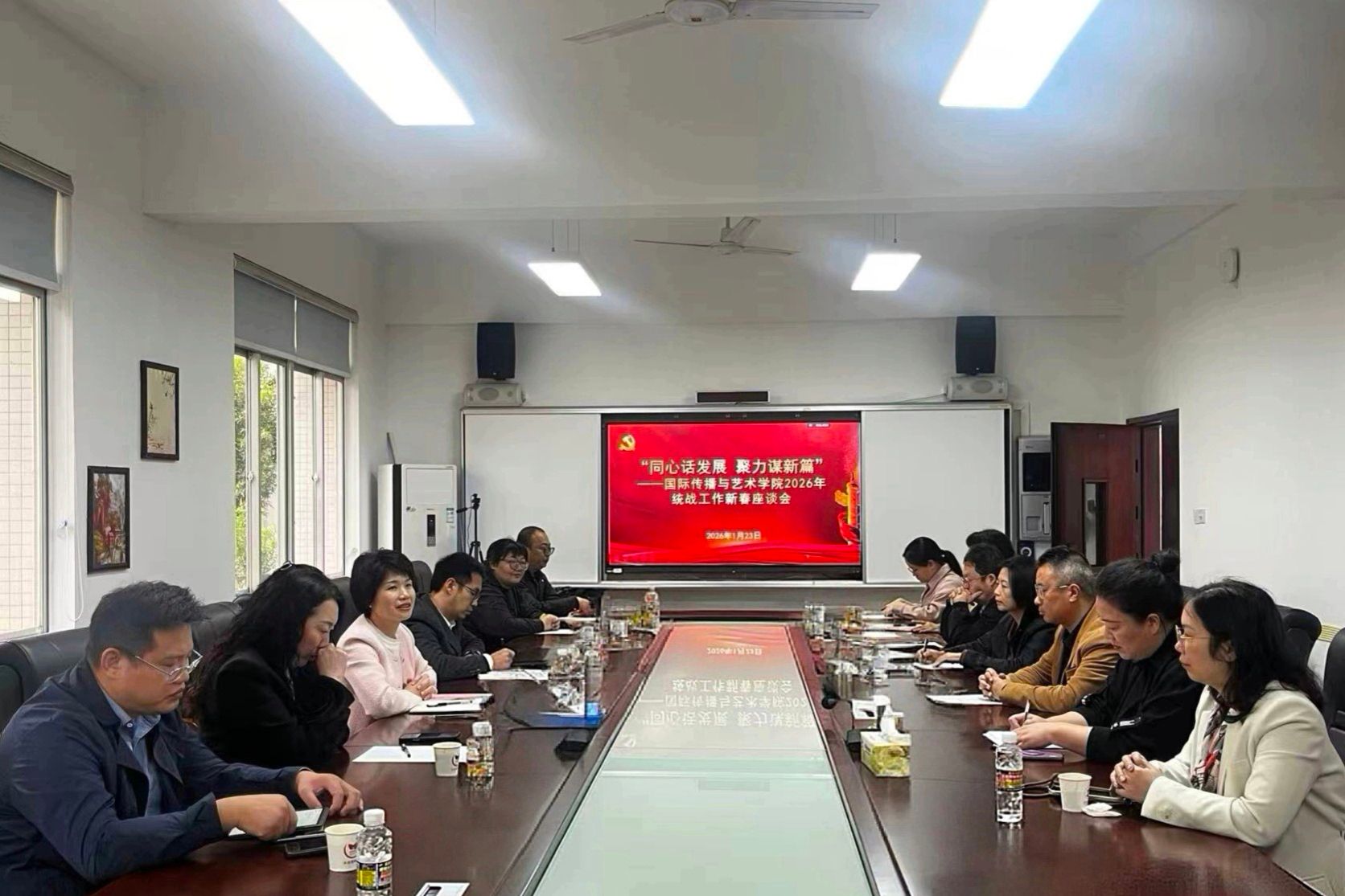 1月23日上午,国际传播与艺术学院2026年统战工作新春座谈会在学院102室召开。学院党委书记何映敏主持会议,党委副书记陈鹏,副院长张军军、元志东出席,学院各民主党派及无党派人士教师代表参会。