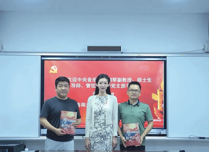 此外,尹一迦还与我院第三党支部党员教师围绕“音乐+思政”主题进行了座谈,从音乐思政课程等方面进行分享和交流。会后,尹一迦将其主编的国家艺术基金青年艺术创作人才资助项目成果《绽放新时代——中国红色经典钢琴室内乐作品集》,捐赠给海南大学国际传播与艺术学院。